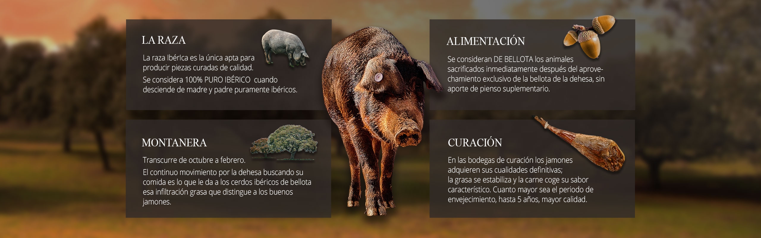 - Montanera: COMPLETA; de Octubre a Febrero. Aproximadamente 3 hectáreas de dehesa por cabeza.